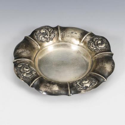 Reich reliefiert, mit Vogel- und Blütenmotiven. Minimal gedellt.
