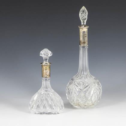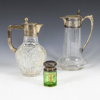 2 decanters and green glass jar with silver mounts.