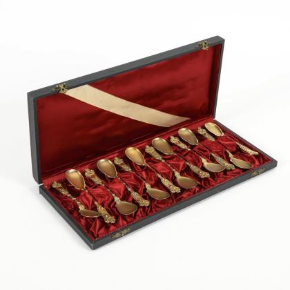 12 gilded ice cream spoons in original case. Bruckmann & Söhne, Heilbronn.