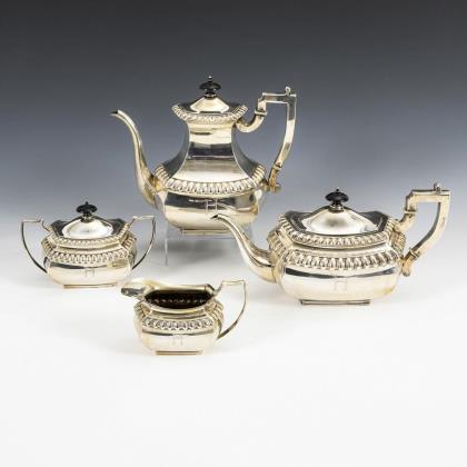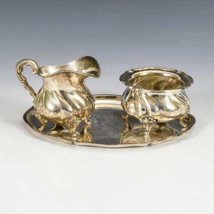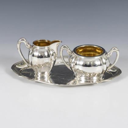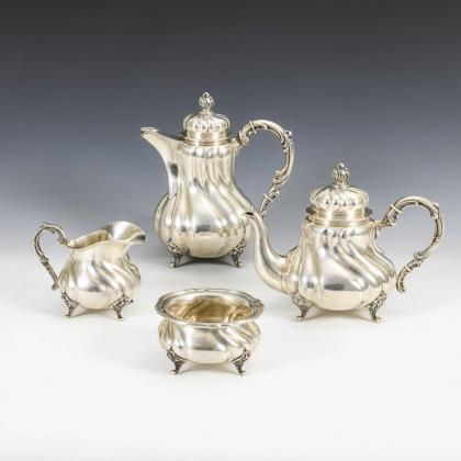Silbernes Kernstück "Dresdner Hofmuster". Halbmond/Krone/800 gepunzt, Juwelierstempel Schnauffer Dresden. H 7 cm bis 25 cm. Gesamt 1968 g. Kaffeekanne, Teekanne, Milchgießer und Zuckerdose mit godronierter Wandung und Rocaille-Henkeln. Beide Kannenhenkel locker.