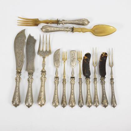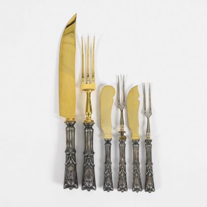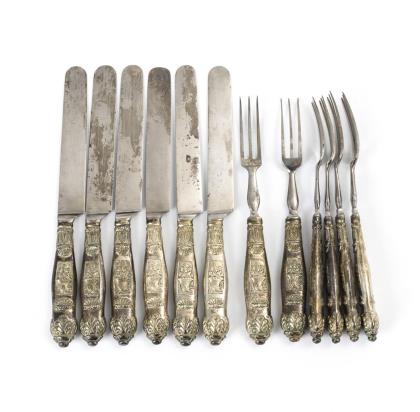 Seltenes Besteck mit reliefierten Silbergriffen: 6 Speisemesser und 6 3-zinkige Speisegabeln. In alter Besteckhülle. Alters- und Gebrauchsspuren.