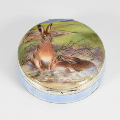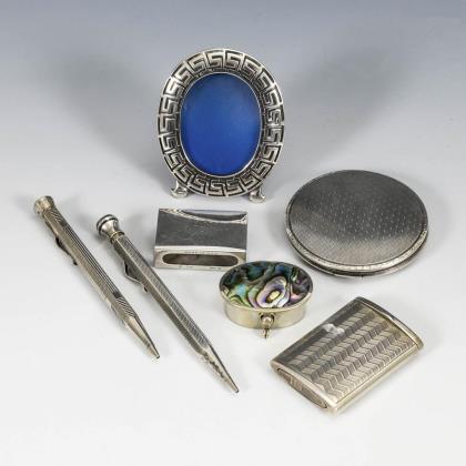 2 Silberstifte, 2 Streichholzhüllen (1 x Cartier), Ovalrähmchen, Döschen mit Silberdeckel, Puderdose