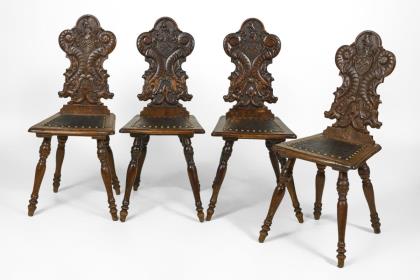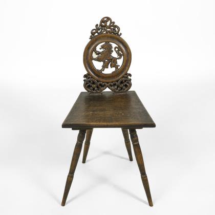 Stuhl mit erhöhter Rückenlehne, auf 4 gedrechselten Beinen mit Fußverstrebung, verziert mit Rocaillen-Schnitzwerk, Lehne und Sitzfläche mit Korbgeflecht. Wohnfertig restauriert.