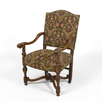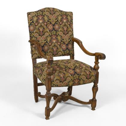 Fauteuil in stiltypisch geschwungener Formensprache, mit gepolsterter Rückenlehne, Armlehnen und Sitzfläche; champagnerfarbener Bezug mit floralem Muster. Wohnfertig restauriert.