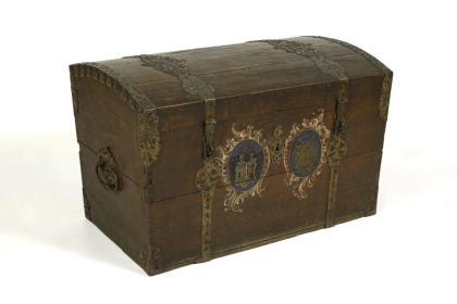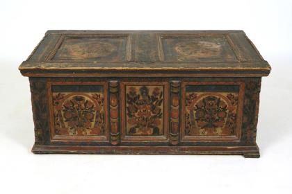 Historistische Kastentruhe mit vorgeblendeter Rahmengliederung mit Ornamenten der Renaissance aus Pilastern und kassettierten Feldern, Sockel mit Blenderschüben; dekoriert mit Rosettenrelief und Sternintarsien. Alters-/Gebrauchsspuren, Verblendung teils fehlend, inaktiver Anobienbefall, Reste polychromer Bemalung.