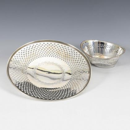 Ovales Schälchen und Teesieb. Beide gepunzt. Um 1900. 1x Frankreich. Silber. H 2,5/5 cm. 218 g. Schwere Saliere im englischen Stil, mit Klauen-Kugel-Füßen. / Französisches Dreibein-Sieb mit Perlmuttgriff. Altersspuren, kleine Dellen.