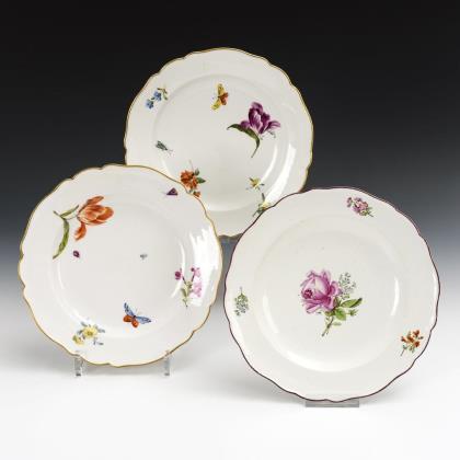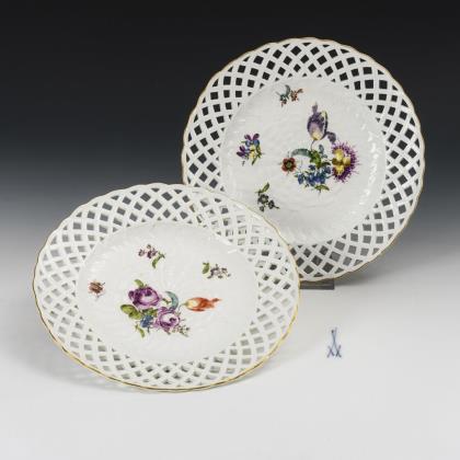 2 Dessertteller mit Blumenmalerei. Ludwigsburg. Blaumarke, 1762-1793. Polychrom bemalt, 1x mit braunem Rand und 1x mit goldenem Rand. 1x mit korbdurchbrochener Fahne (Ø 25 cm) und 1x mit ringdurchbrochener Fahne (Ø 28,5 cm). 1x mit kleiner Randrestaurierung, 1x mit kleiner Randbestoßung.