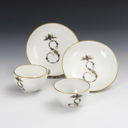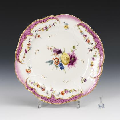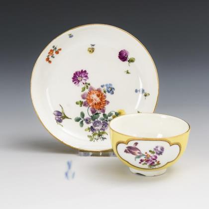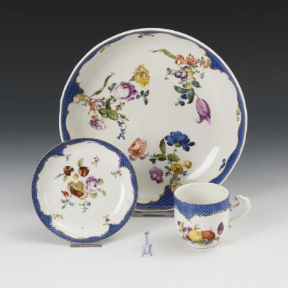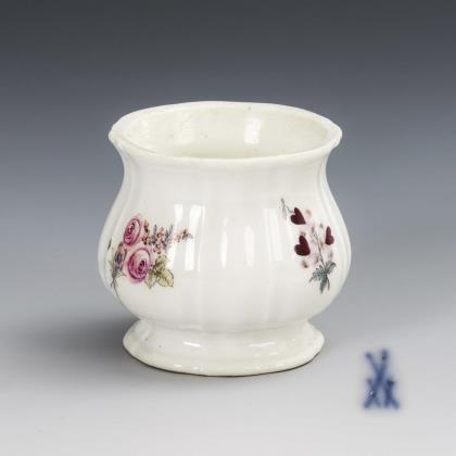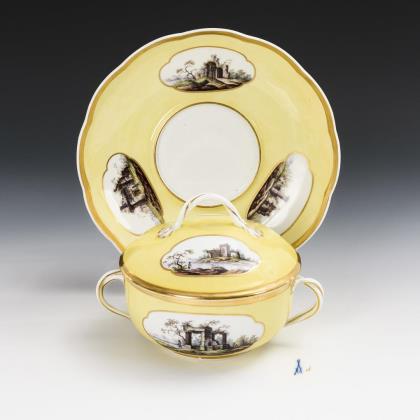 Reliefdekor "Ozier". Beidseits passig geschweifte Reserven mit Blütenrelief. Innen feine farbige Bemalung. Im Fond Goldspitzenreserve mit Landschaft und Figurenstaffage, florale Ornamente in Purpur und Eisenrot, Goldstaffage. Vierpassig geschweifter Korpus. Schwertermarke