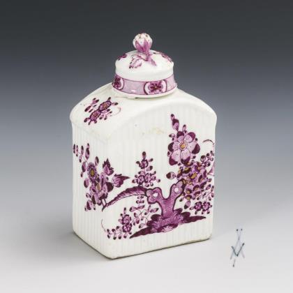 Rechteckige Dose mit gebrochen gerippter Wandung und Blütenknaufdeckel. Mit purpurfarbener Kakiemonmalerei