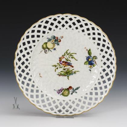 Speiseteller in der Form "Altozier". Im Spiegel jeweils die Darstellung eines Baumes mit zwei Vögeln, auf der Fahne, Insektenmalerei