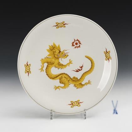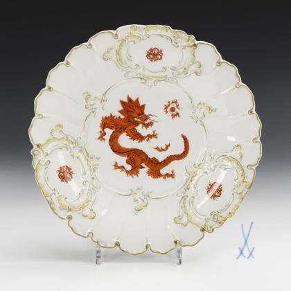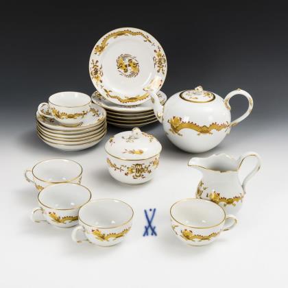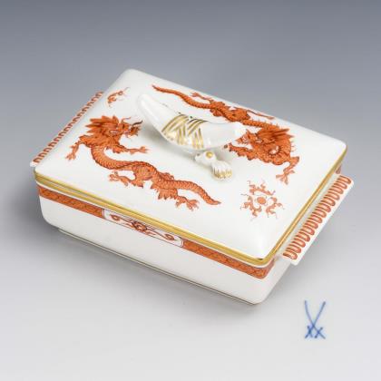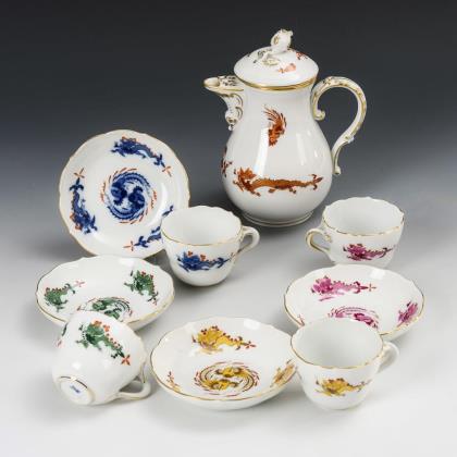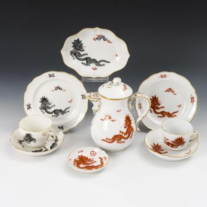 Pot, 2 mocha covers and 2 bowls with dragon painting. Meissen.