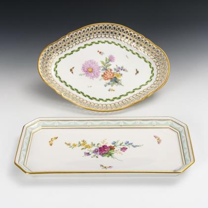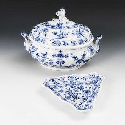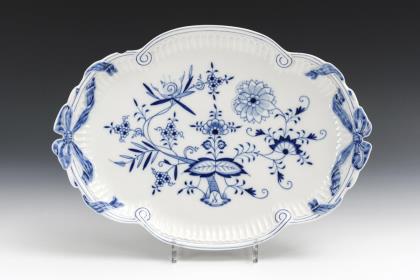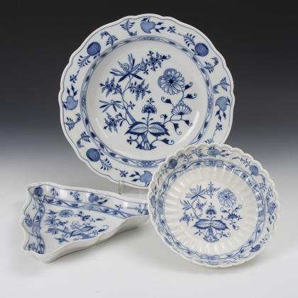 Onion pattern vegetable plate, triangle bowl and fan bowl. Meissen.