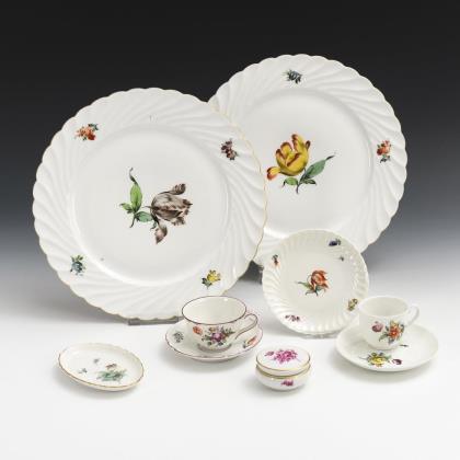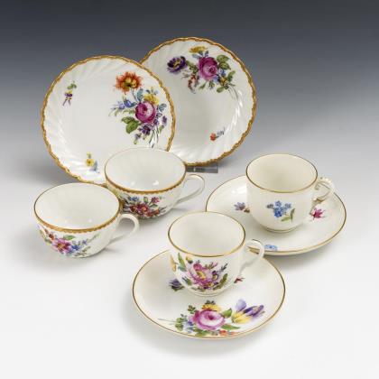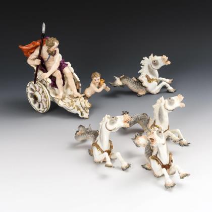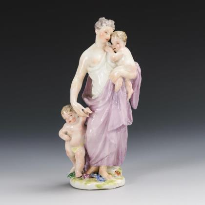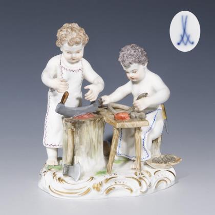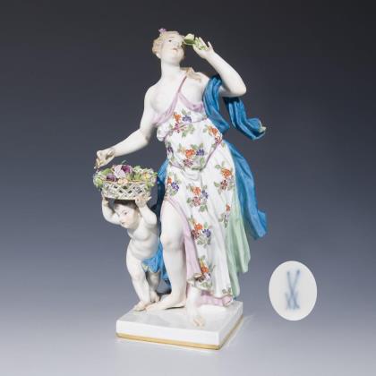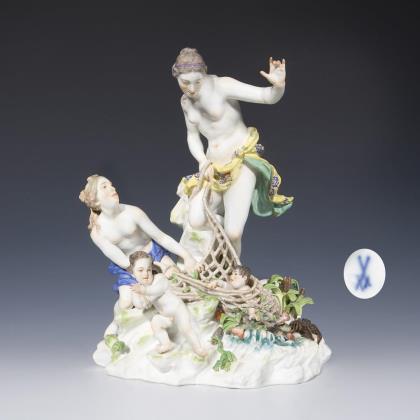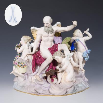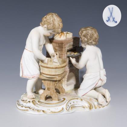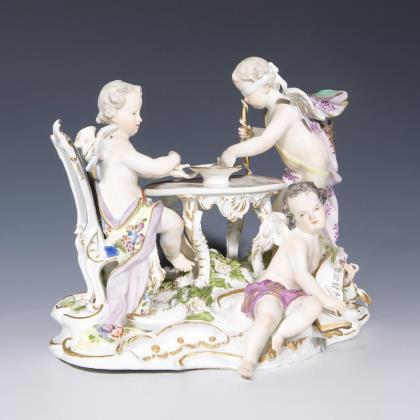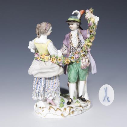 Modell von Johann Friedrich Eberlein 1745. Pendant zu Modell-Nr. 669, 688, 691. Die Gruppen wurden auf verschiedenen Sockeln modelliert. Farbig bemalt, gold staffiert. Ritzmarke, Pressmarke, Malermarke, Schwertermarke