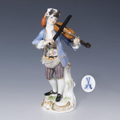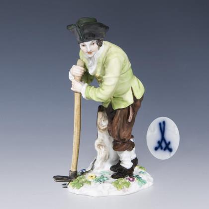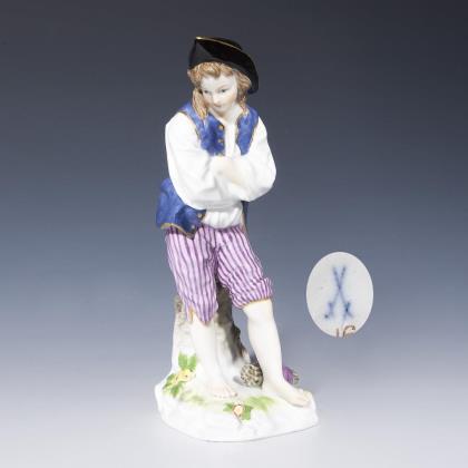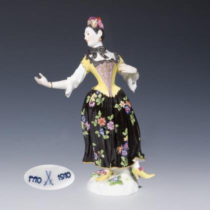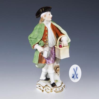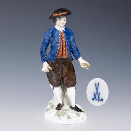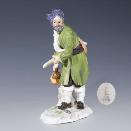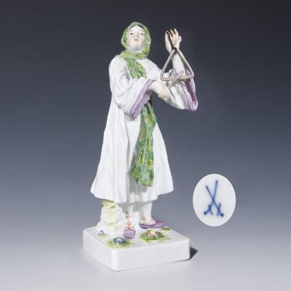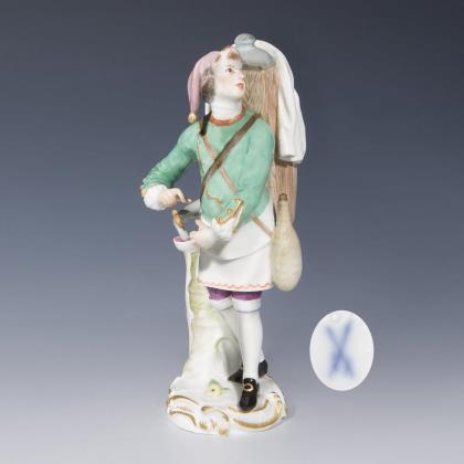 Modell von Peter Reinicke 1753-1754. Aus einer Serie von 34 Figuren. Farbig bemalt, gold staffiert. Ritzmarke, Pressmarke, Malermarke, Schwertermarke einmal gestrichen