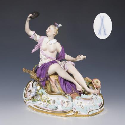 Modell von Johann Joachim Kaendler 1739-1741. Pendant zu Modell-Nr. 236. Farbig bemalt, gold staffiert. Ritzmarke, Pressmarke, Malermarke, Schwertermarke, Jubiläumsmarke 1710-1910