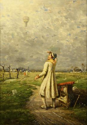 BEINKE, Fritz (1842 Düsseldorf - 1907 ibid.). Genre scene with hot-air balloon.