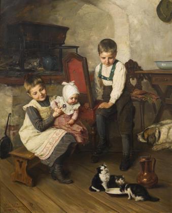 WAGNER, Paul Hermann (1852 Rothenburg/Silesia - 1937 Kochel). Children with drinking kittens.