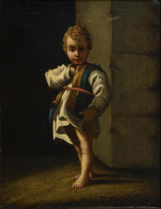 RICHTER, Ludwig Umkreis Bildnis eines Jungen Öl/Leinwand. Unsigniert. 19. Jh. 27,5 x 22 cm. Gerahmt : 42 x 36 cm. Der Junge in weißem Hemd mit blau-goldener Weste an einer Mauer im Sonnenschein. Altersspuren.