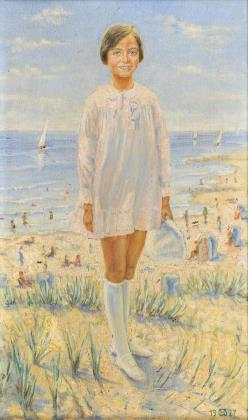 WÜNSCH, Rudolf Ein Mädchen am Badestrand Öl/Leinwand. Rechts unten monogrammiert. Datiert: 1927. 44,5 x 26,5 cm. Gerahmt : 50 x 32 cm. Bildnis eines lächelnden Mädchens auf einer Düne oberhalb des Strandes im Sonnenschein.