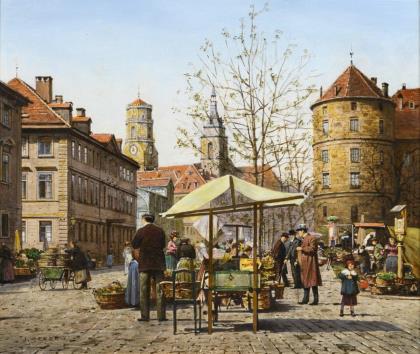 HERCZEG, Jozsef (* 1958). Market hustle and bustle on Karlsplatz - Stuttgart.