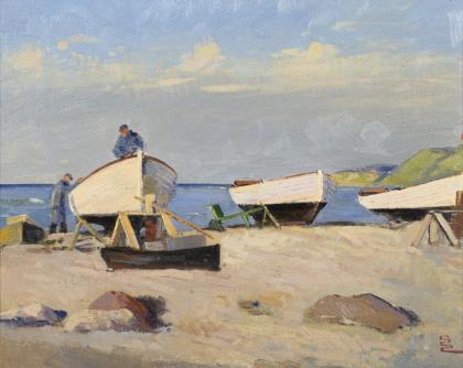 CHRISTENSEN, Svend Sinding (1898 Copenhagen - 1980 ibid.). Boat builder on the beach.