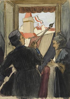 Genre scene with hoisted flags.