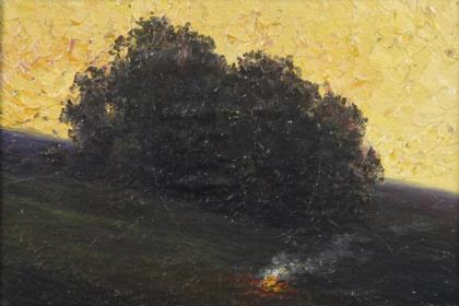 Small evening landscape with group of trees and campfire.