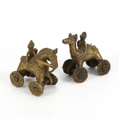Zwei Frauen, auf Qilin reitend. Rückseite mit Schriftblock. Gold an den Handhaben etwas berieben, dort winziger Chip.