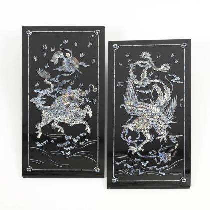 2 panels with mother-of-pearl inlays: phoenix and qilin.