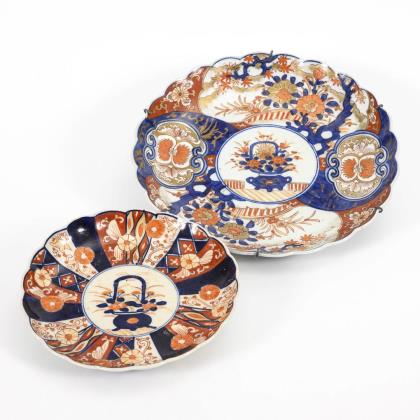 Teller mit roter und Unterglasur-Blaumalerei und gewelltem Rand. Silbermontierung wohl in Europa alt aber nachträglich gefertigt. Rand mit alten Chips, Teller für Halterung durchbohrt.
