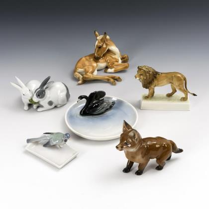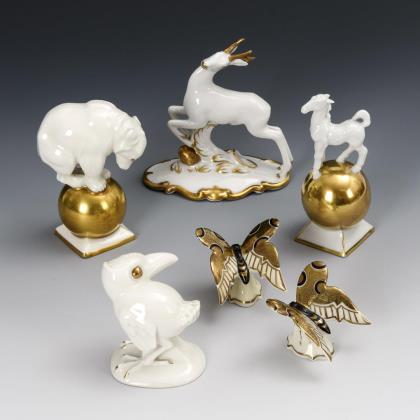 Eisbär auf Goldkugel, kleines Pferd auf Goldkugel, Rehbock, Vogel und 2 Schmetterlinge