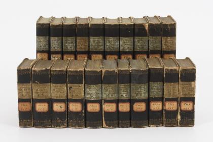 Large volume of books with mostly gold embossed spine.