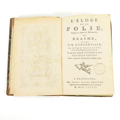 "Compose en forme de declamation par Erasme. Et traduit par Mr. Gueudeville, Avec les Notes de Gerard Listre, ... Le out fur l'original de l' Universite de Basle. Nouvelle Edition ...". Bildnisse von ERsame, Morus und Holbein auf einer Seite, Titelkupfer, Titel, (14), 234, (14) Seiten mit 75 Seitenillustrationen und 6 Tafeln. Französische Sprache, Halbledereinband