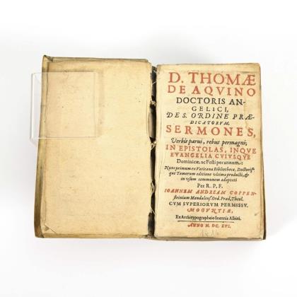 "Doctoris angelici de S. Ordinare praedictatorum, sermones, Verbis parvi, rebus permagni; In Epistolas, Inque Evangelia Cuiusque Dominicae, ac Festi per annum". Titel, Widmung, 442, (16), 6 Leerseiten und "R. P. F. Joannis Andreae Coppenstein Mandalensis Ord. Praedicator. Theol. Dispositiones Concionum in totum annum, ad sensum literalem, & saepe mysticum: Ex D. Thomae De Aquino Commentariis In Matthaeum Et Joann. Et Ex S. Bonaventurae Comment. In Lucam Passim in Evangelia Lucae suppletur ... Tomus primus ..." 716 Seiten. Im Pergamenteinband