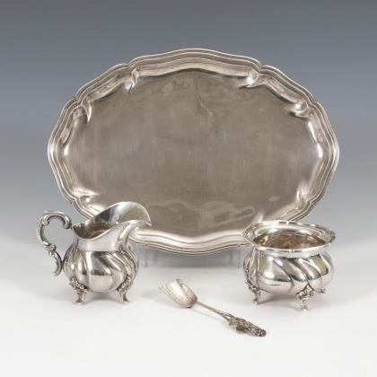 Sugar and cream set on tray with sugar spoon. Dresden silverware factory.
