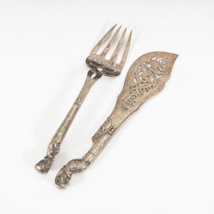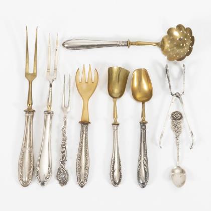 Reich reliefierte Silbergriffe im Stil des Klassizismus: Tranchierbesteck, Butter- und Käsemesser sowie 2 kleine Gabeln. Zinken und Klingen vergoldet. Bei einer Gabel Griffansatz defekt.