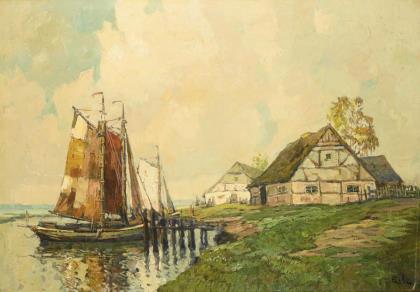 PRIEBE, Rudolf (1889 Shulakovo/Kiev - 1964 Hamburg). Fishing cottage with sailors.