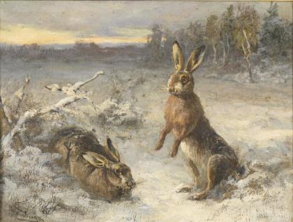 WEINBERGER, Anton (1843 Munich - 1912 Wiesbaden). Two Hares in Winter.