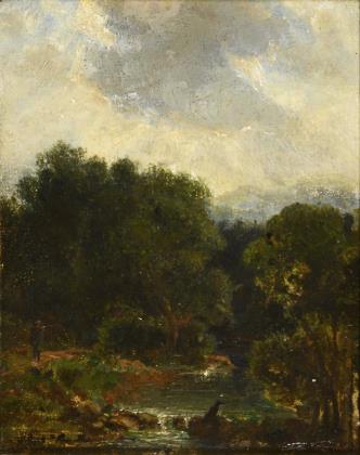 Fein gemalte Genreszene in weiter Landschaft. Geschwärzter Profilrahmen mit Goldleiste