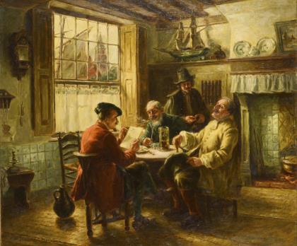 Liebevoll erzählte bayrische Genreszene im Interieur. Originaler Keilrahmen, originaler breiter vergoldeter Stuckrahmen