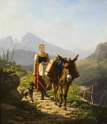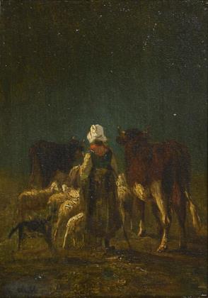 DUPRÉ, Léon Victor (1816 Limoges - 1879 Paris). Landscape with girl and cows before farmstead.