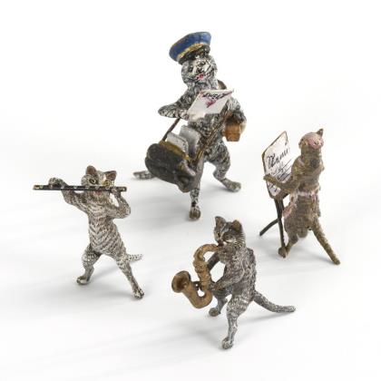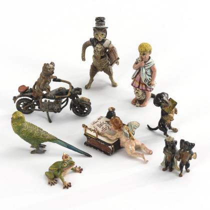 Metallguss mehrfarbig in der Art einer Bronze gefasst/patiniert, oblonge schwarze Marmor-Plinthe mit roten Marmor-Zierelementen in der Front. H 23 cm, gesamt 26 x 55 x 16 cm. 7,1 kg.