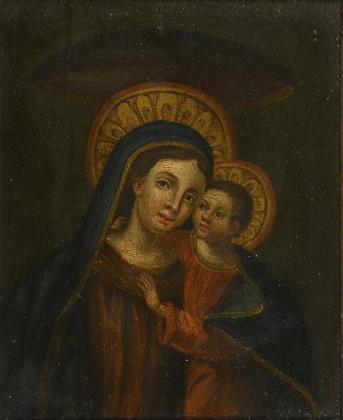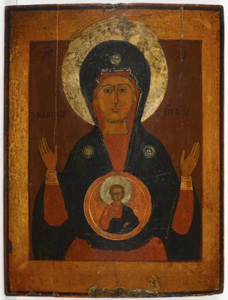 Vielfigurige Ikone Eitempera/Holz. Russland. 2. H. 18. Jh. 45 x 38 cm. Maria mit dem Jesusknaben, umringt von Heiligen, darunter verschiedene Szenen. Altersspuren.