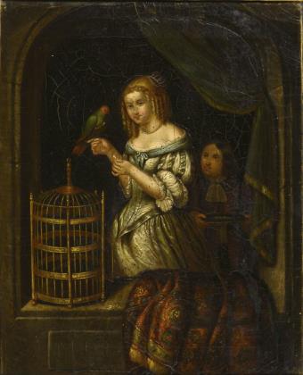 Copy after Gerard Dou?: Young woman with bird of paradise.