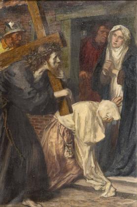 Viele Personen bei der Grablegung an der Höhle mit dem Leichnam Jesu. Altersspuren.