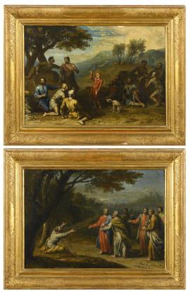 BEICH, Joachim Franz (1665 Ravensburg - 1748 München) Paar religiöse Szenen Je Öl/Leinwand. Je unsigniert. Je 31 x 43 cm. Gerahmt Je 43 x 56 cm. Darstellung der Heilung des Lahmen am Wegesrand sowie eine Szene mit Hirten, die gespannt einem Jungen zuhören Je Leinwand doubliert. Bayerischer Hofmaler und Radierer. Literatur : Thieme/Becker. Provenienz : Aus süddeutschem Adelshaushalt