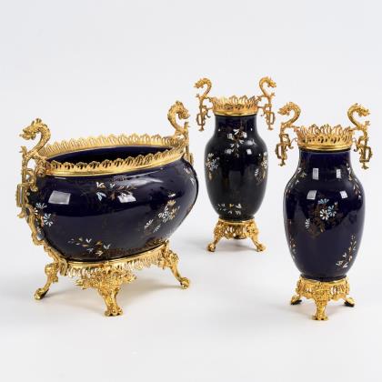 Wilhelminian jardinière and 2 side vases with bronze mounts. Keller & Guérin, Lunéville.
