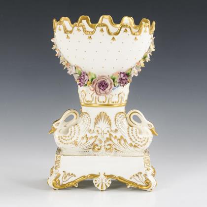 Very finely modeled centerpiece with swans and flowers.