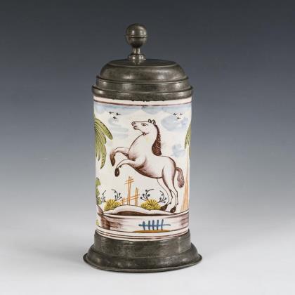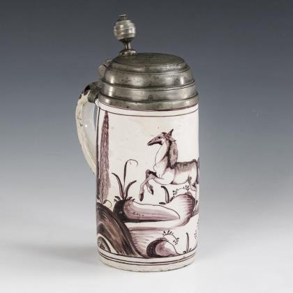 Thuringian faience roller jug with jumping horse.