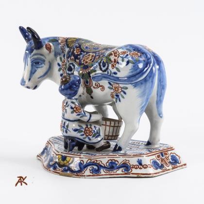 Delft faience group: cow with milking farmer's wife.